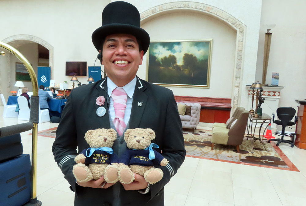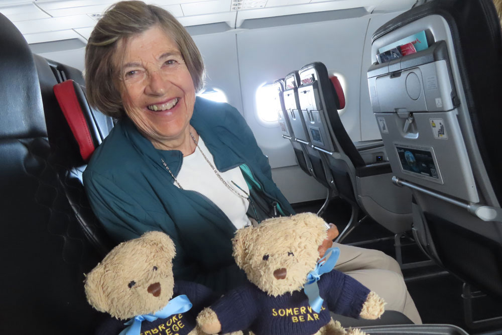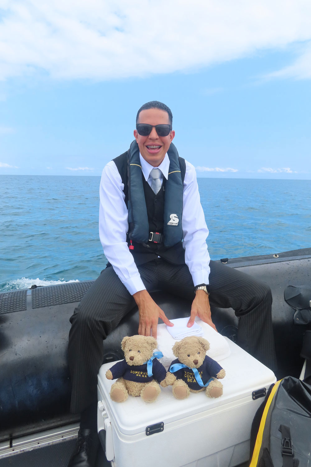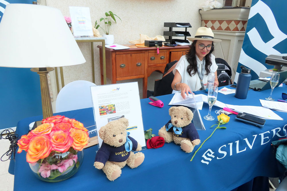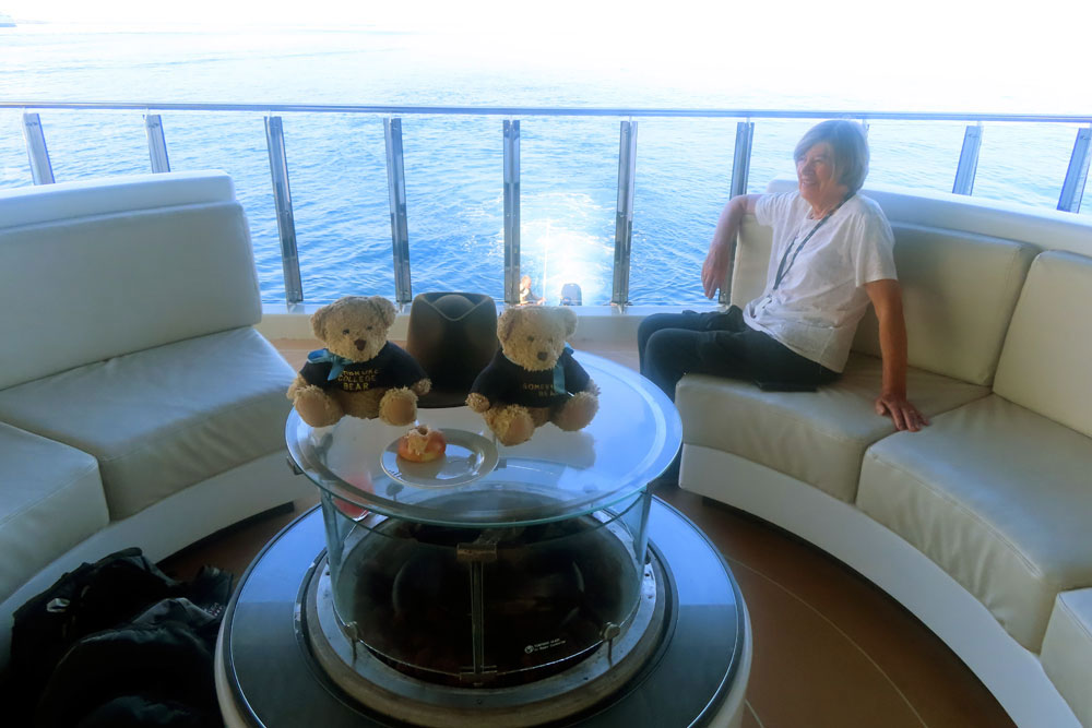 | This is how the masses travel, dunno why she is so happy | Once installed ay the poncy hotel - JW Marriott - we eyed his hat | But he was holding on to it, so we helped out at the Silversea desk |