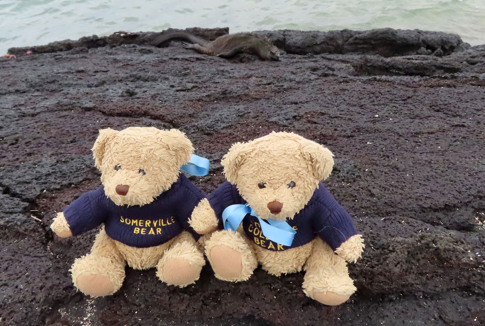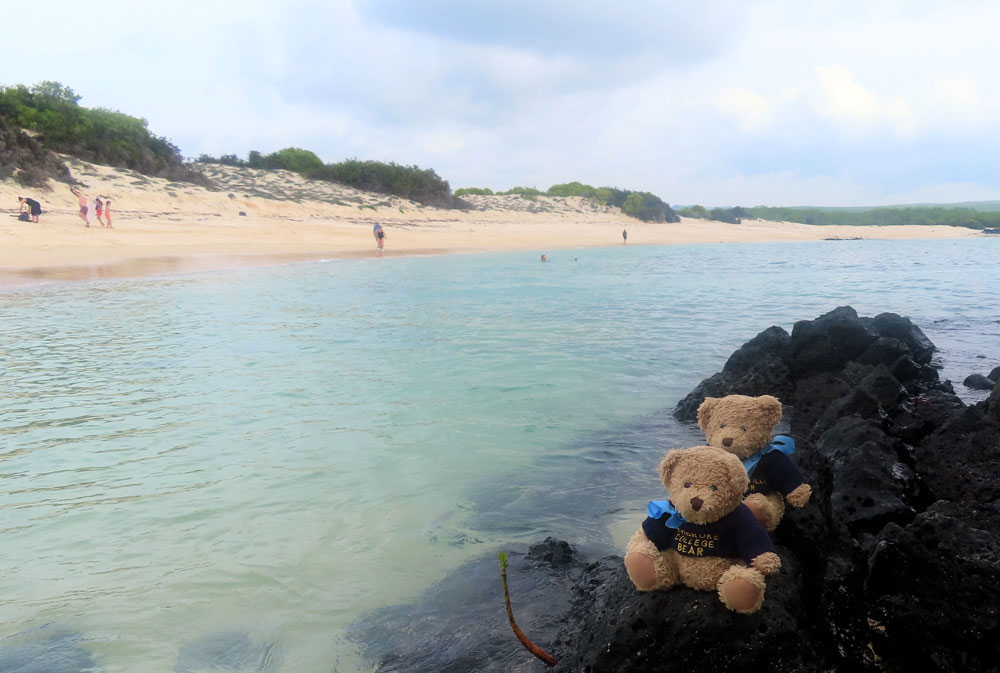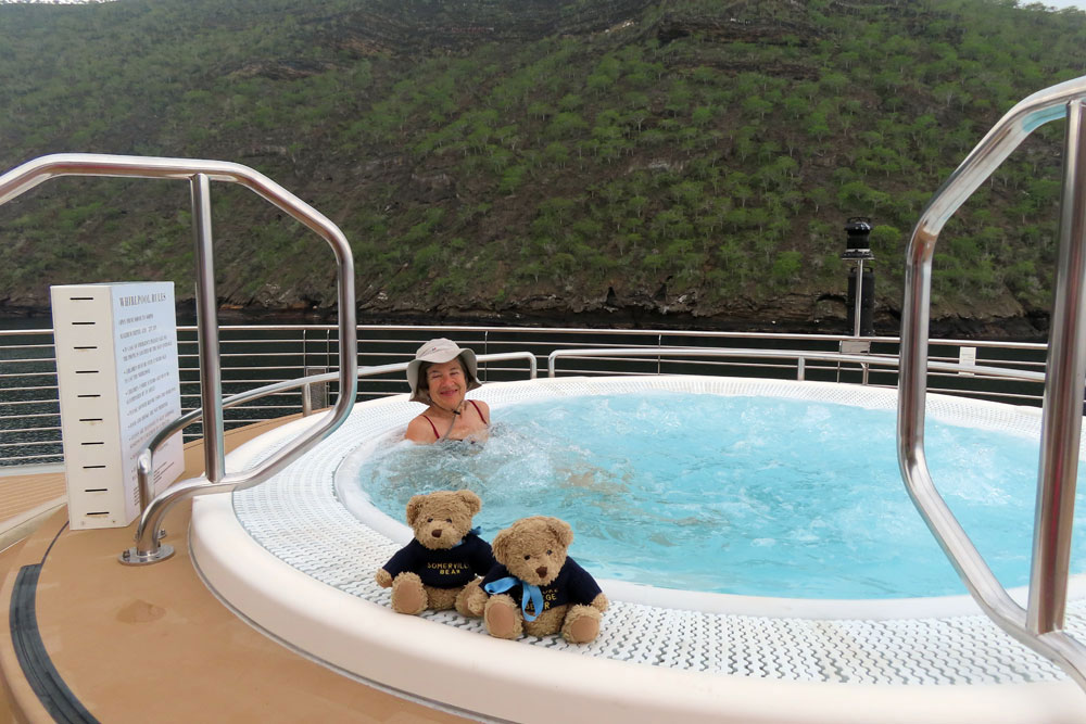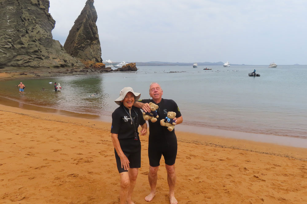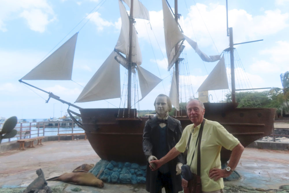 | ..for a last swim before heading back to the ship | You might deduce the firepit is not lit, otherwise scorched bottoms | ..On the harbour on the way home, there were lots of sea lions | We found Charles Darwin at last. Still working on another book |