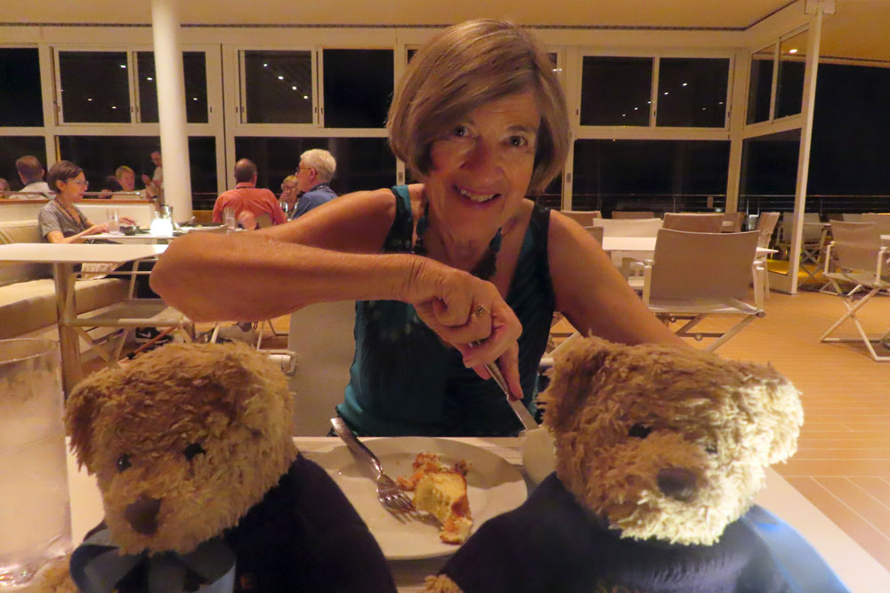 | Our home for the next week -Silver Origin. Hope the food is good | First evening on board and it looks good so far | The we find the dining room and things are even better | It was a long way up the hill, especially with short legs |