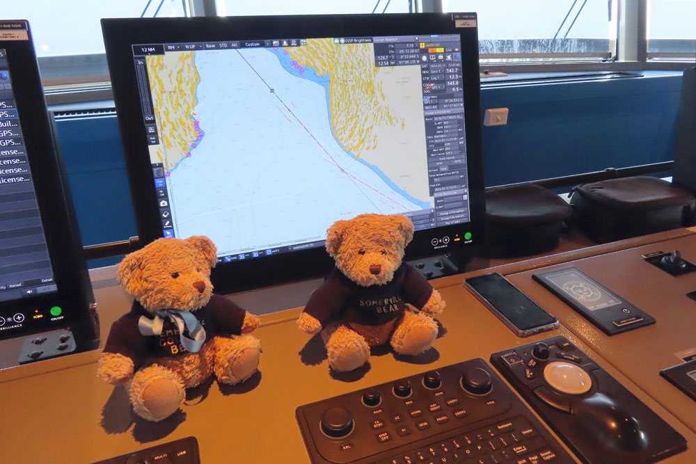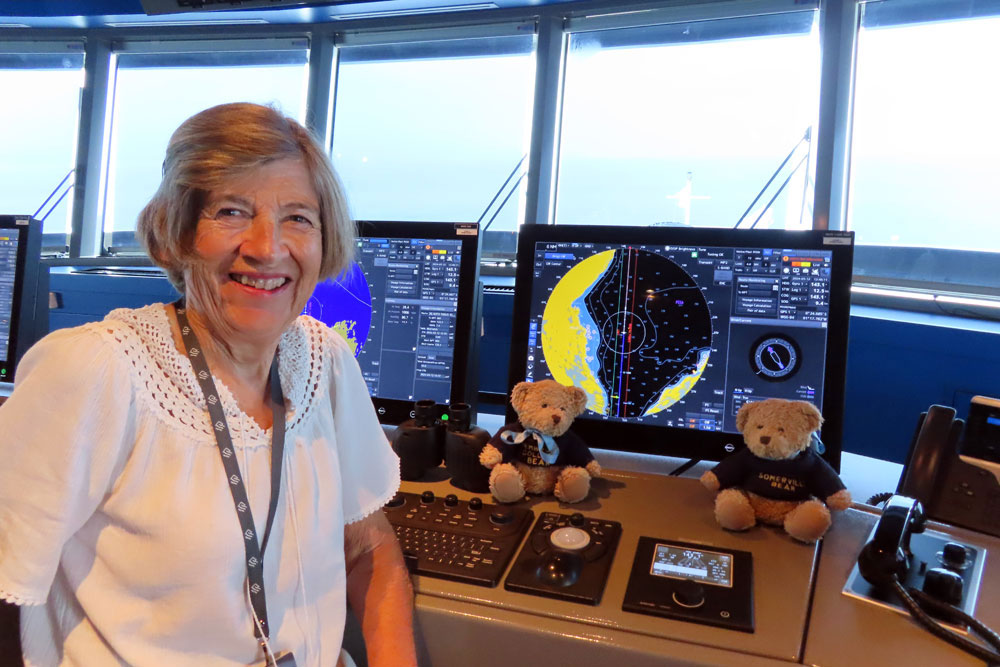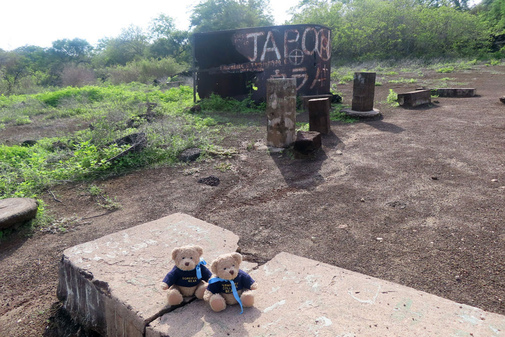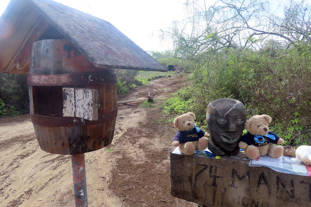 | The Captain must have got a bit lost as he invited us to the Bridge | ..to help with navigation and steering the ship. All OK now | Ashore at Post Office Bay is this cute little post box. | ..and canning factory ruins, but someone has eaten all the cans |