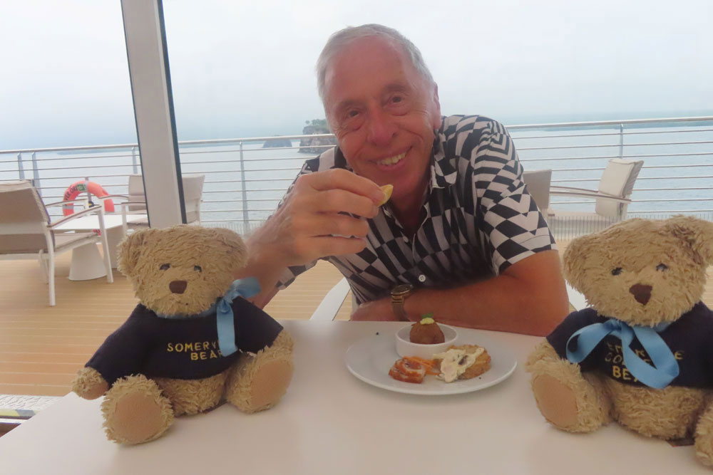 | Then our Butler, Danny (we said it was poncy on the ship) gave .. | ..us a special private ride with a glass of Prosecco .. | ,, and a climb to a viewing point | . Pembroke was quite exhausted by the climb |