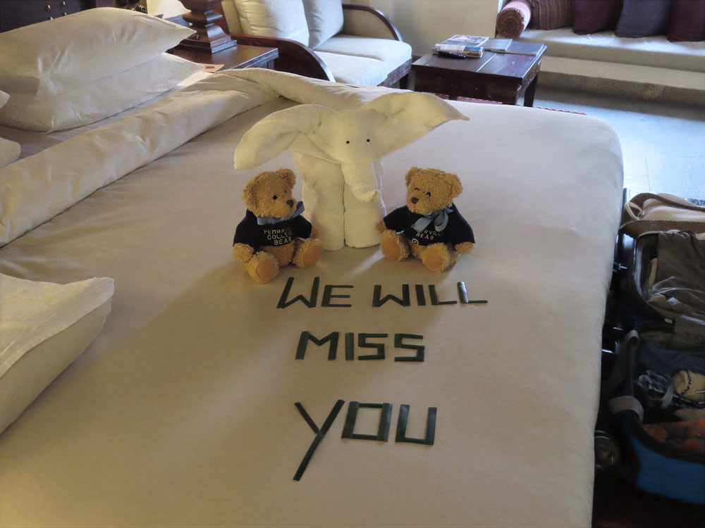 | Suitable hotel for young gentlemen bears .. | .. and a pool for the madre | The full turnout to greet us. These guys know how to welcome us | ...And even a friend for us on the bed |