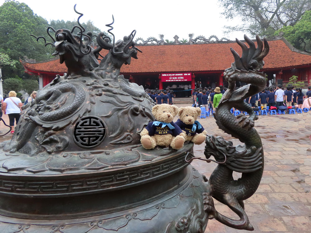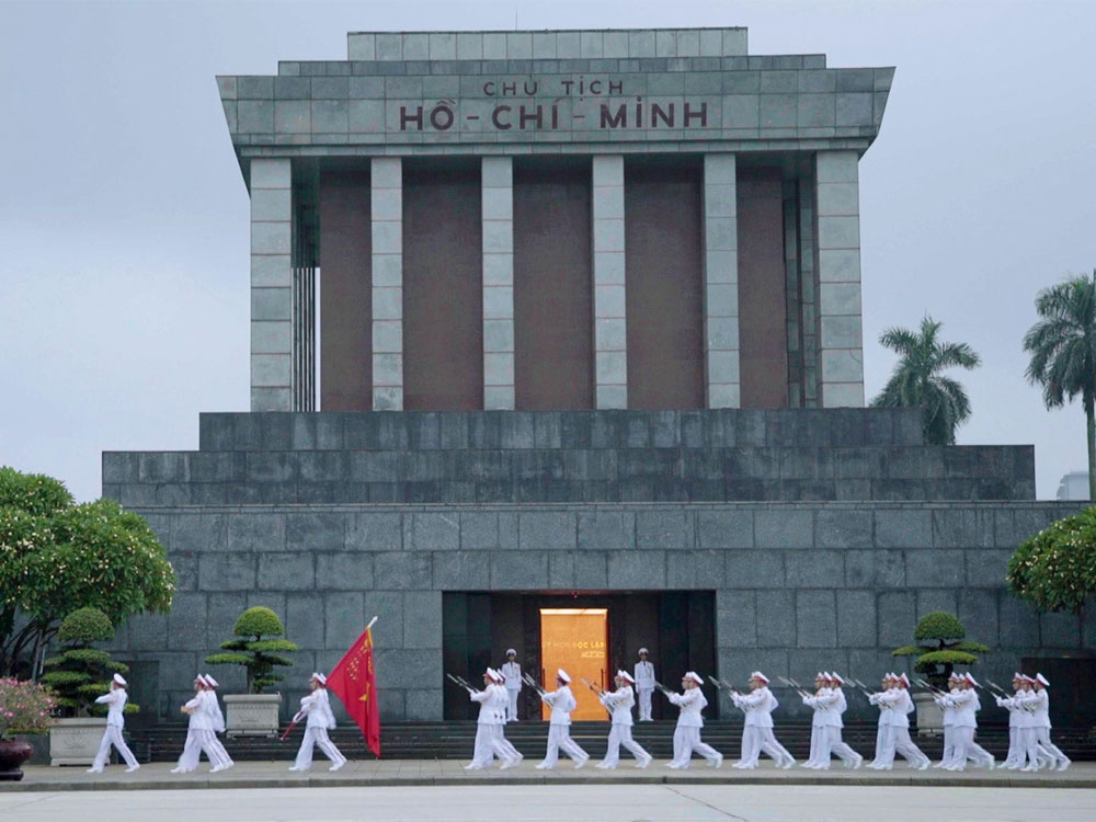 | We steered clear of this open air class | The surly guide would not let us near Ho's mausoleum | so we relied on our telephoto lens to see what was happening | Impressive display of goose stepping |