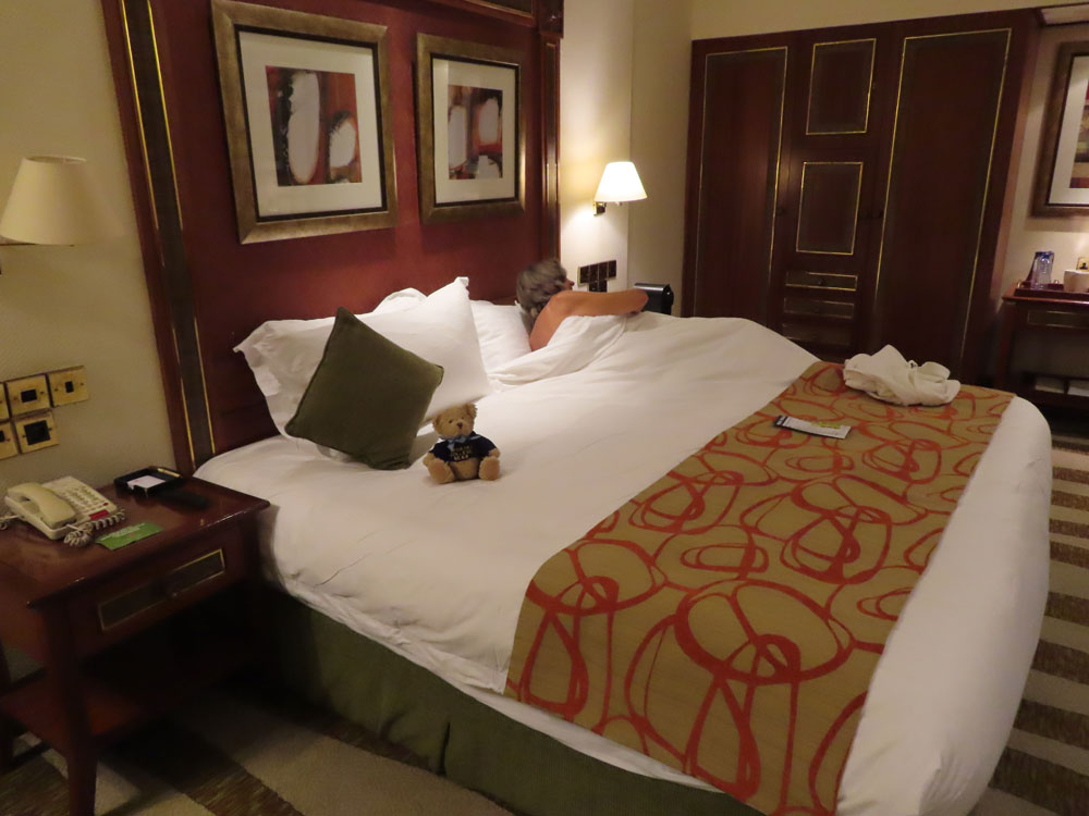 | Result of wandering off by herself in Kigali. Bad Girl. | Straight to bed in Kilimanjaro Hotel | Nice Club room in the hotel, with club lounge .. | ..and private outside club area with cocktail and tapas hours |