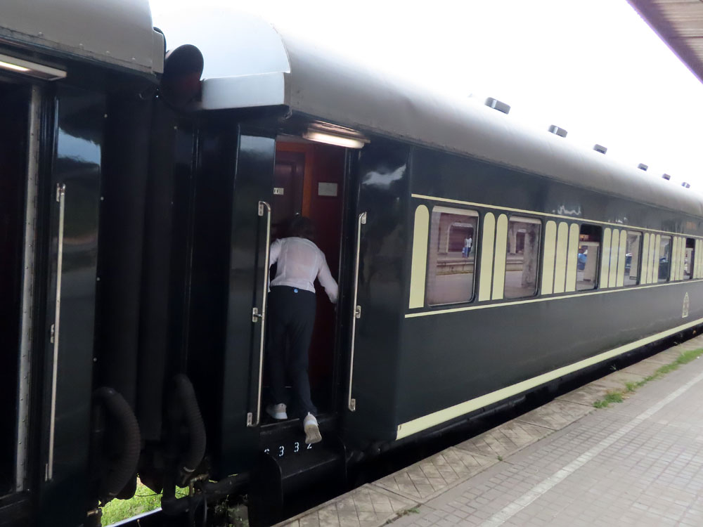 | We thought he might not let us on the train | Guess who was last onto the train | Lawrence, the train manager, welcomes all aboard | Mr Vos thoughtfully supplied plenty of snacks |