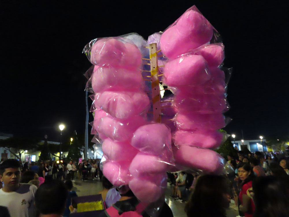 | The square was full of revelers for 12th night. Candy floss sellers | Next morning the riot police were waiting for us in the square | But we just carried on sliding down the central monument | This fellow was in a Trujillo museum |
