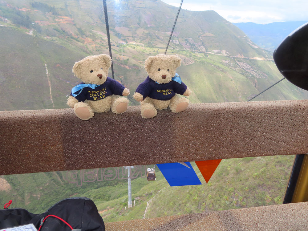 | Taking the cable car certainly beats walking | That is us enjoying the cable car ride | ..but you do not beat the whole walk, it is then 2 km up to .. | ..the mysterious city of Kuelap |