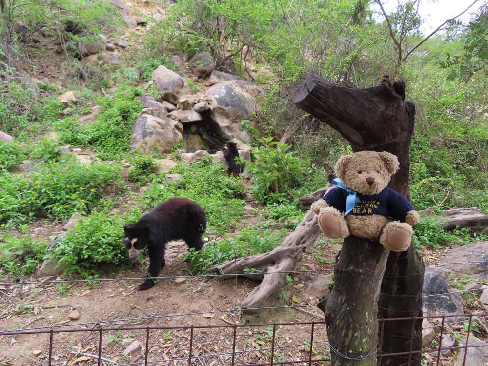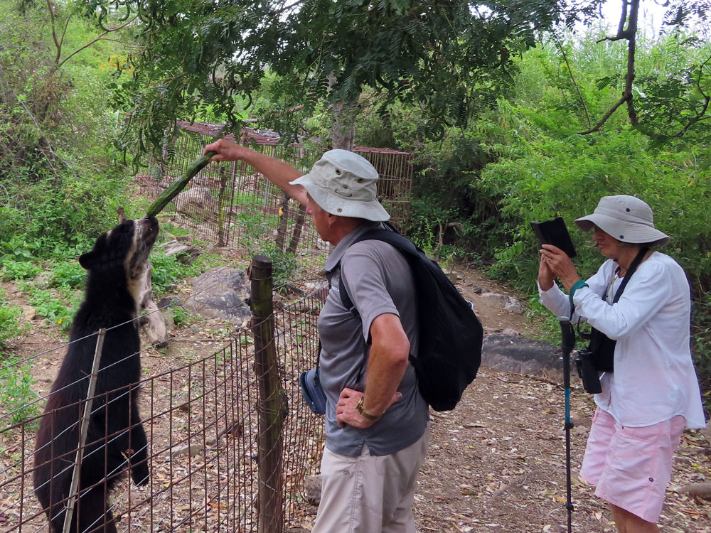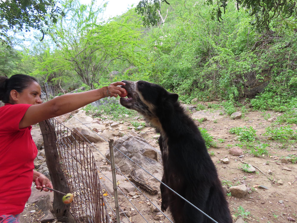 | Next day a drive over what were rough roads, even by Peruvian standards, to the Chaparri Bear Sanctuary | This was a great disappointment to us. It was an open air zoo. | Visitors brought fruit to feed the bears, who were behind an | .electric fence. The madre kept well back. |