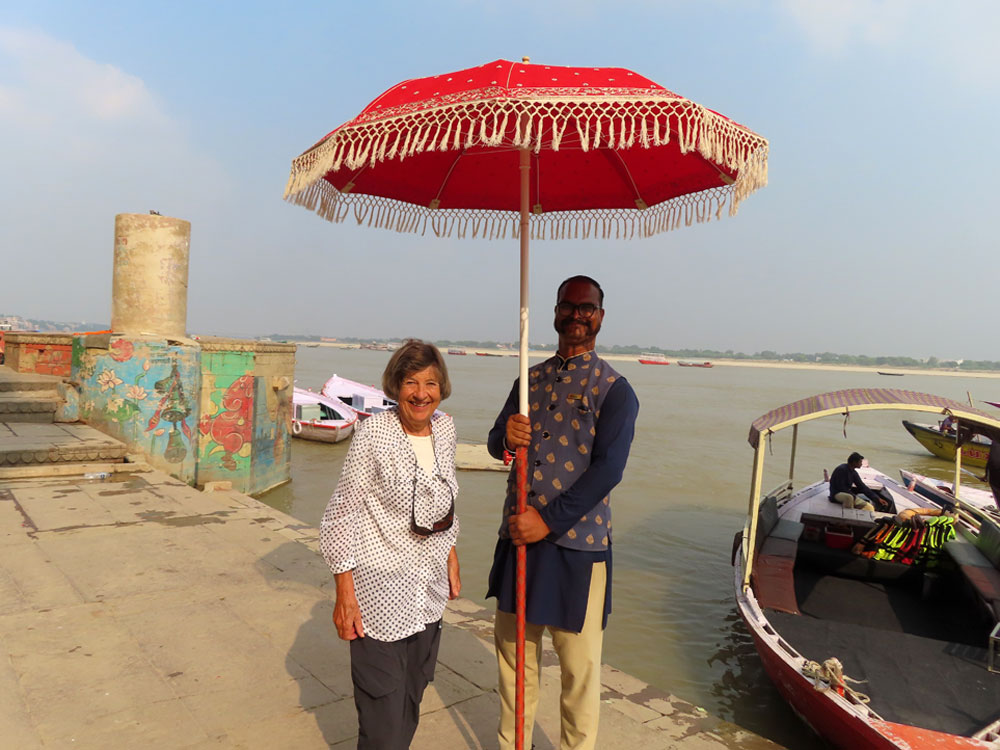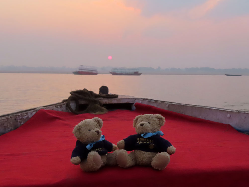 | They got us up to see sunrise over the Ganges at 05.30. Pollution meant we could hardly see the sun. Should have stayed in bed | Our guide was so exhausted at the early rising that he fell asleep | Thousands of people came to Varanasi to wash away sins .. | .. and some came just to do the family laundry |