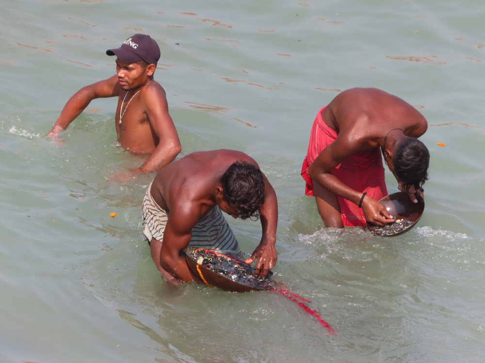 | Looking for coins that pilgrims have thrown in to the Ganges | ..but most of the people just washing their sins away | And we had a ride from a hard working man on a rickshaw |
