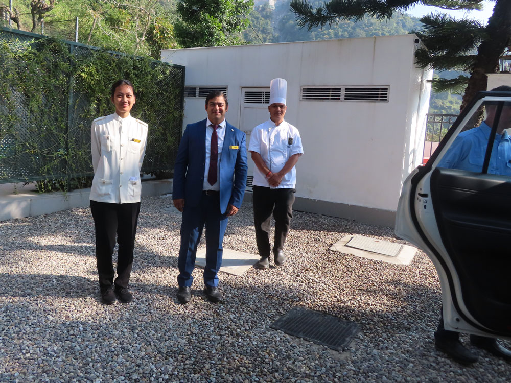 | But when we got there , the hotel was an ex-palace | ..it was very impressive, right on the river | .. and even had had a lift added for access from the river | As you'd expect, it had the poncy extras like the umbrella man |