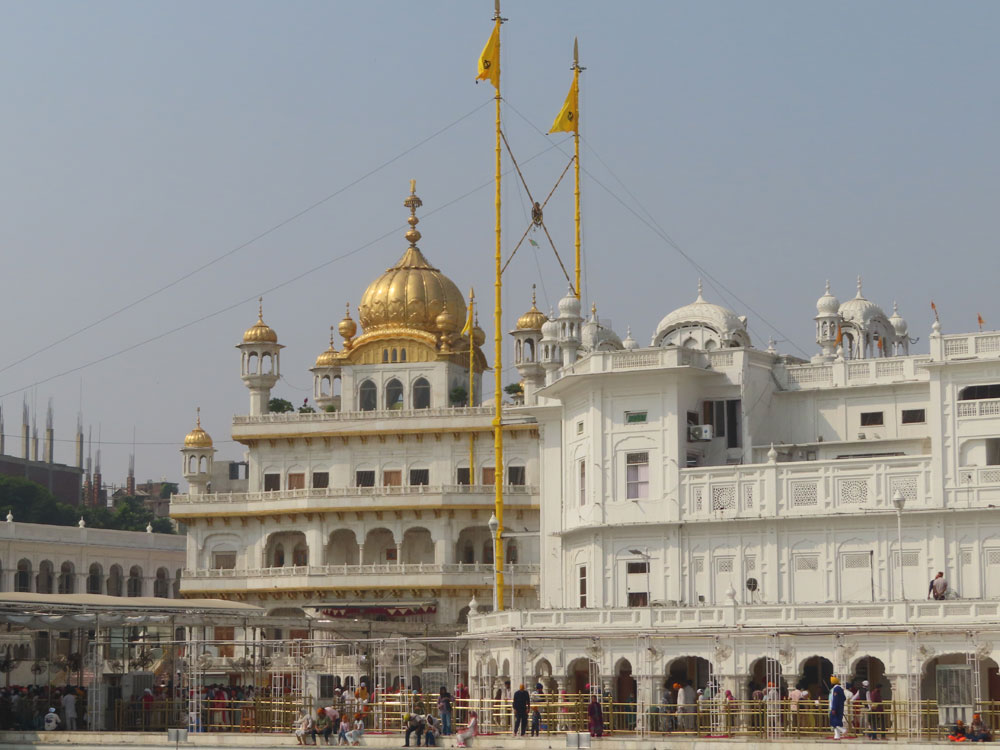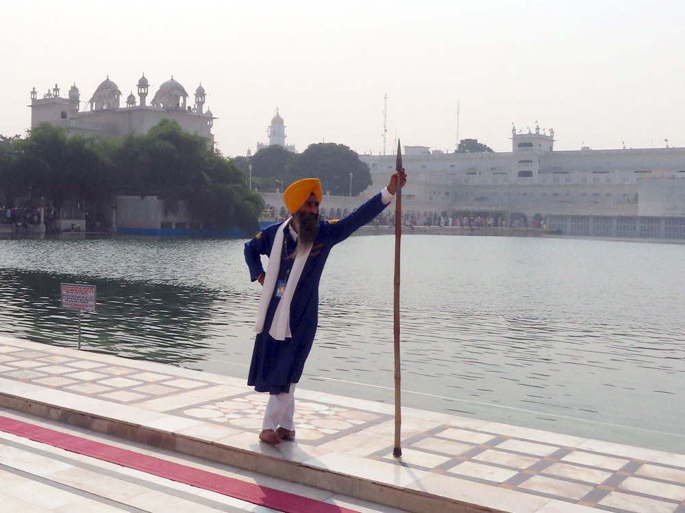 | The daytime visit to Golden Temple saw the headgear go back on | .. And there were masses of these fierce guards to enforce it | World HQ for Sikhs | and the Golden Temple by day |
