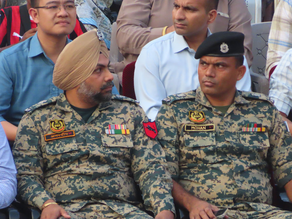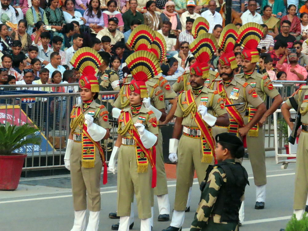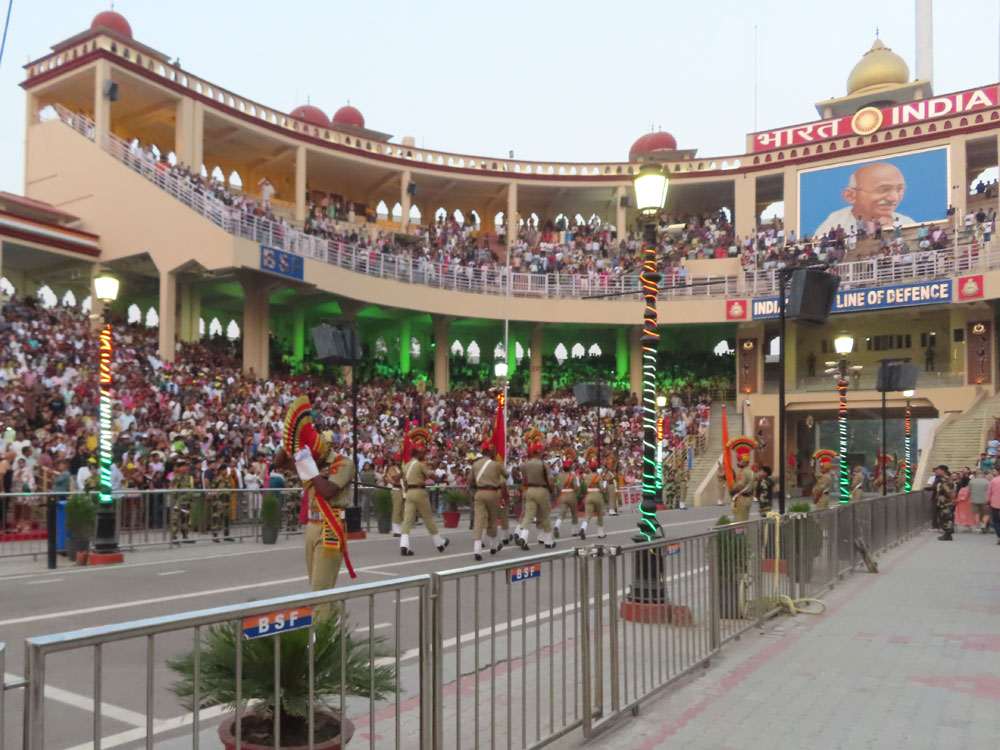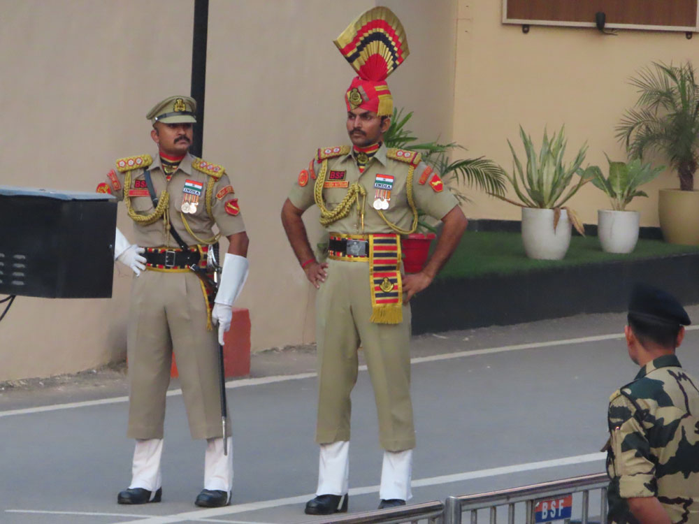 | And our final outing to the Pakistan Border at Wagah Gate .. | ..was really impressive. Fierce looking ladies twirled rifles.. | ..the two commanders looked bored. | ..then the main act arrived. |